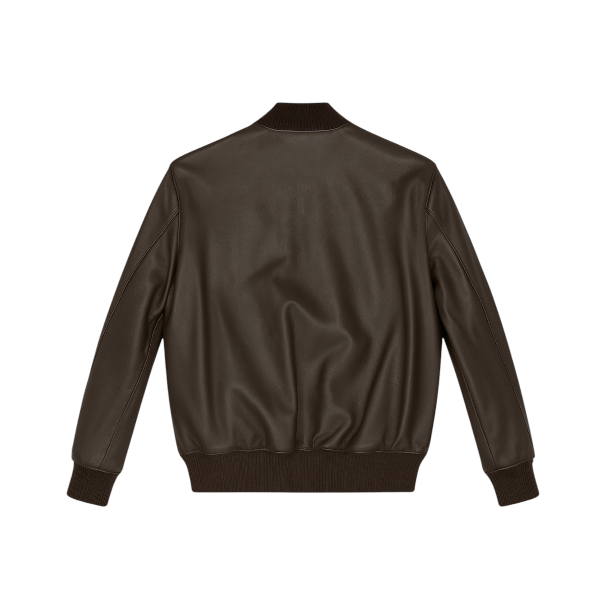 A stylish brown leather bomber jacket featuring a ribbed collar, zippered front, and practical pockets, perfect for a classic yet modern look. Front sticker optional.
