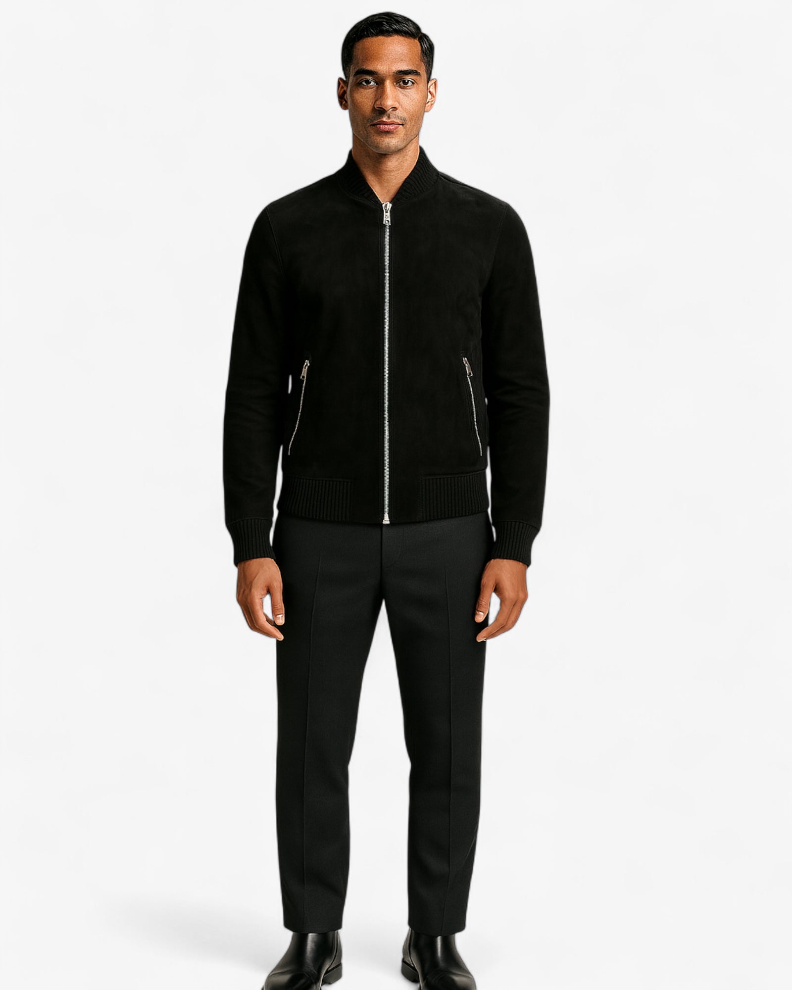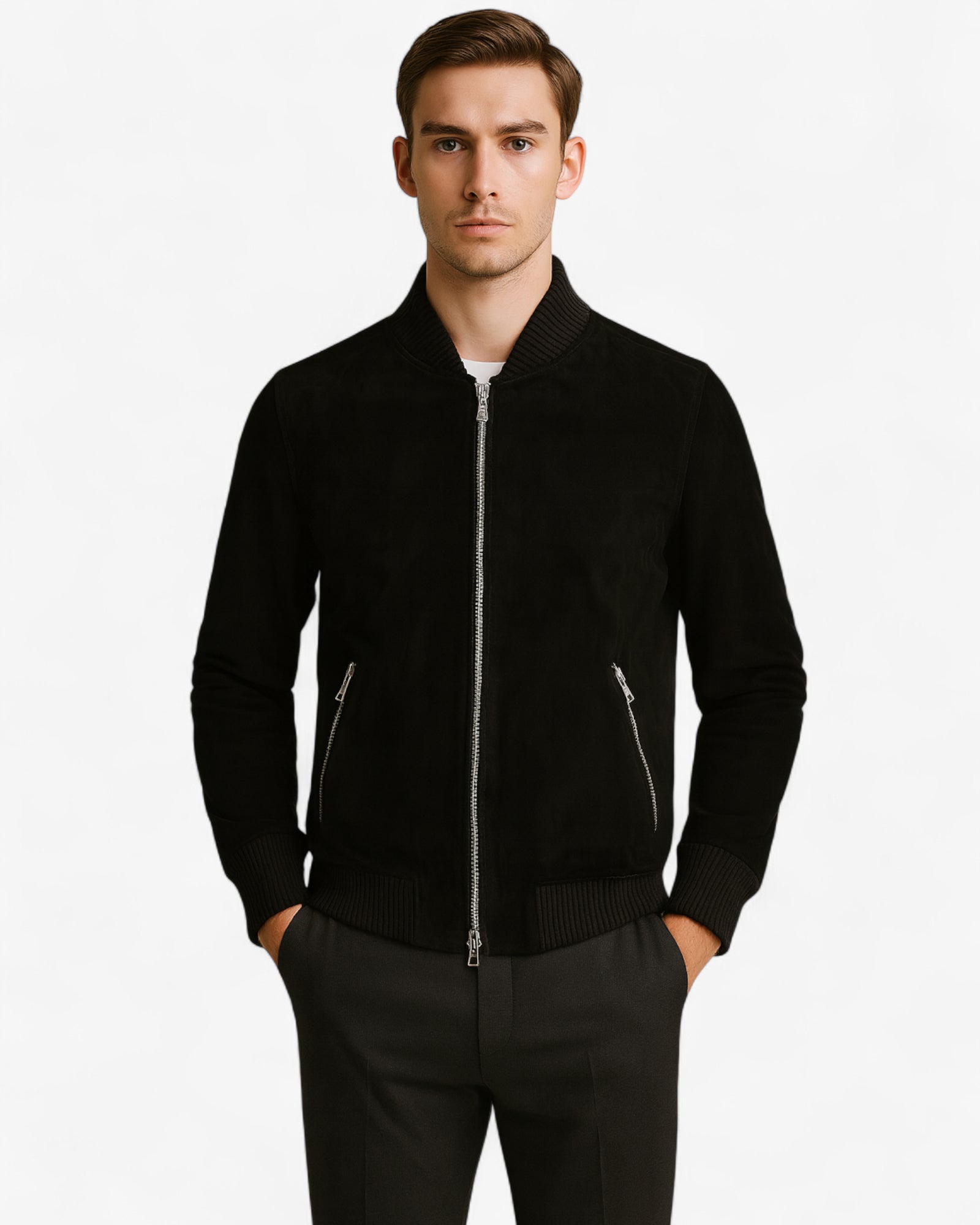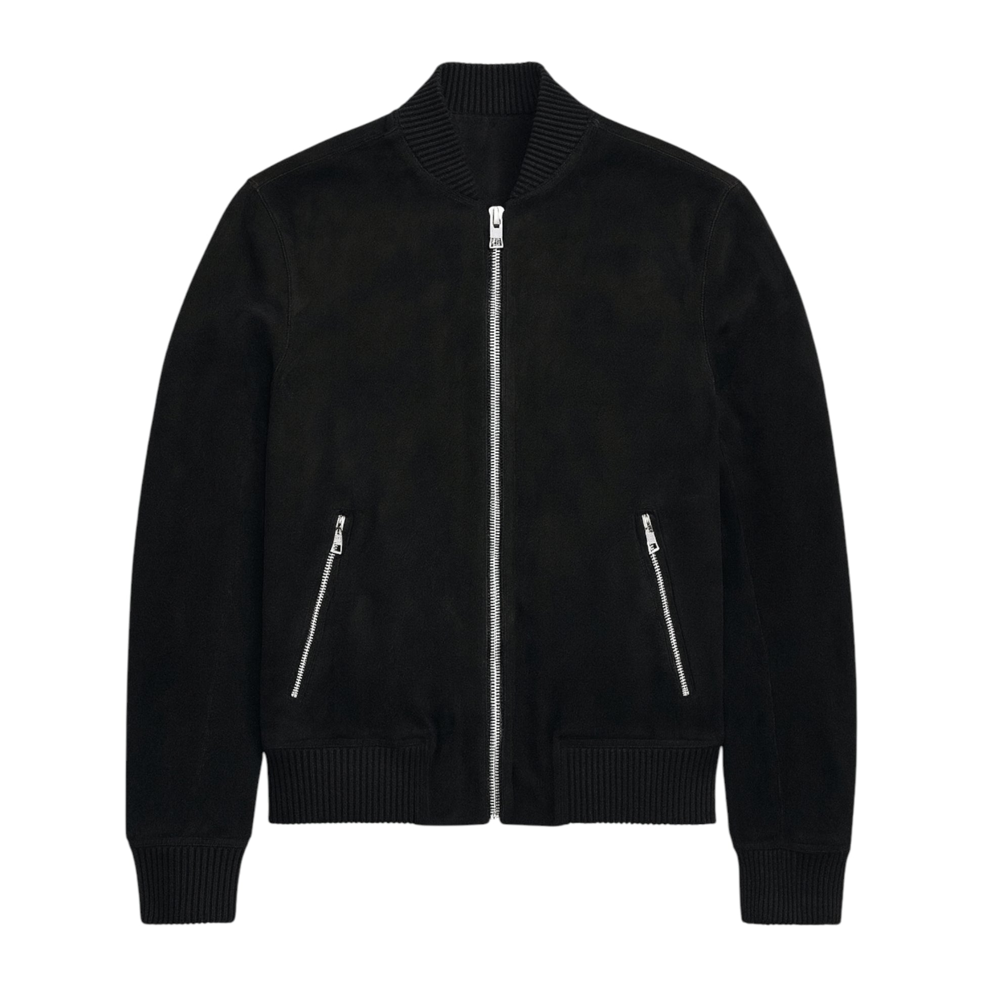 A sleek black suede bomber jacket featuring a zip-up front and two side pockets, crafted from soft suede for a stylish and modern look.