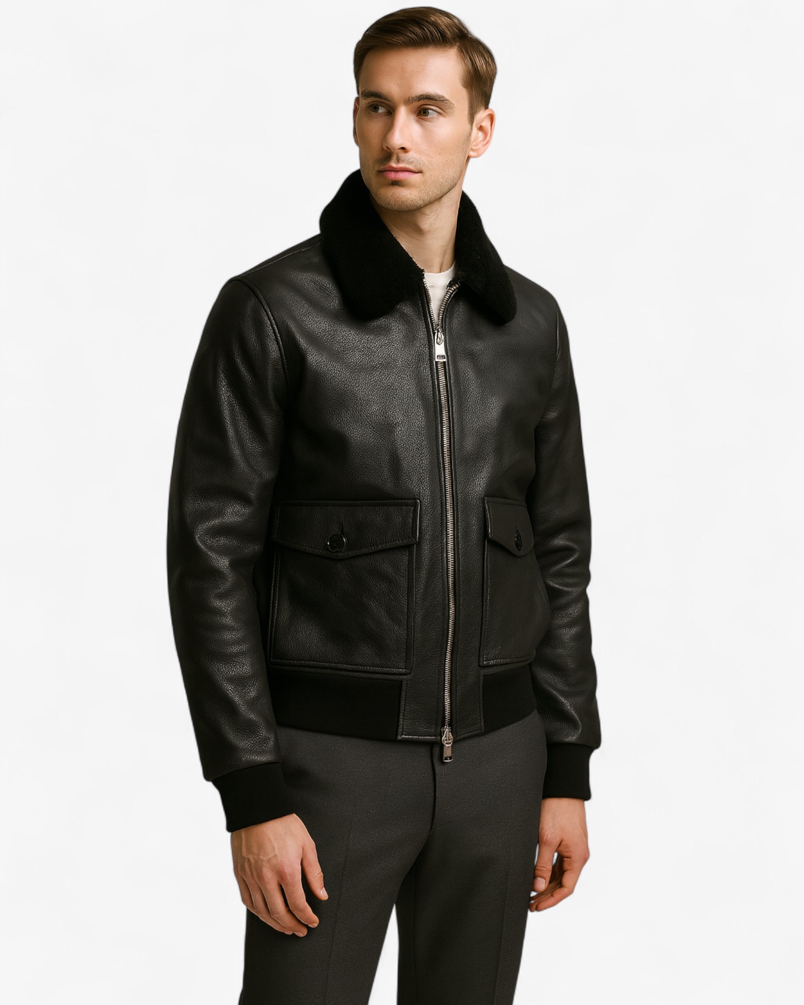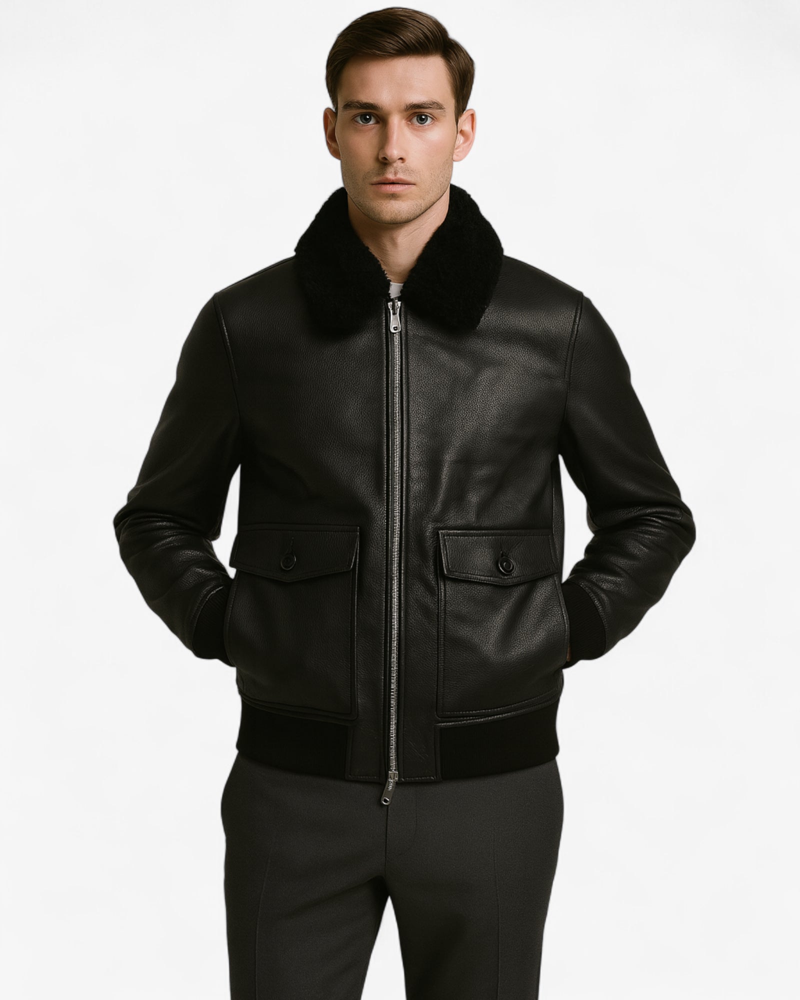 A stylish black leather jacket featuring a cozy fur collar, zip closure, and practical front pockets, perfect for a modern, sophisticated look. Detachable fur collar.
