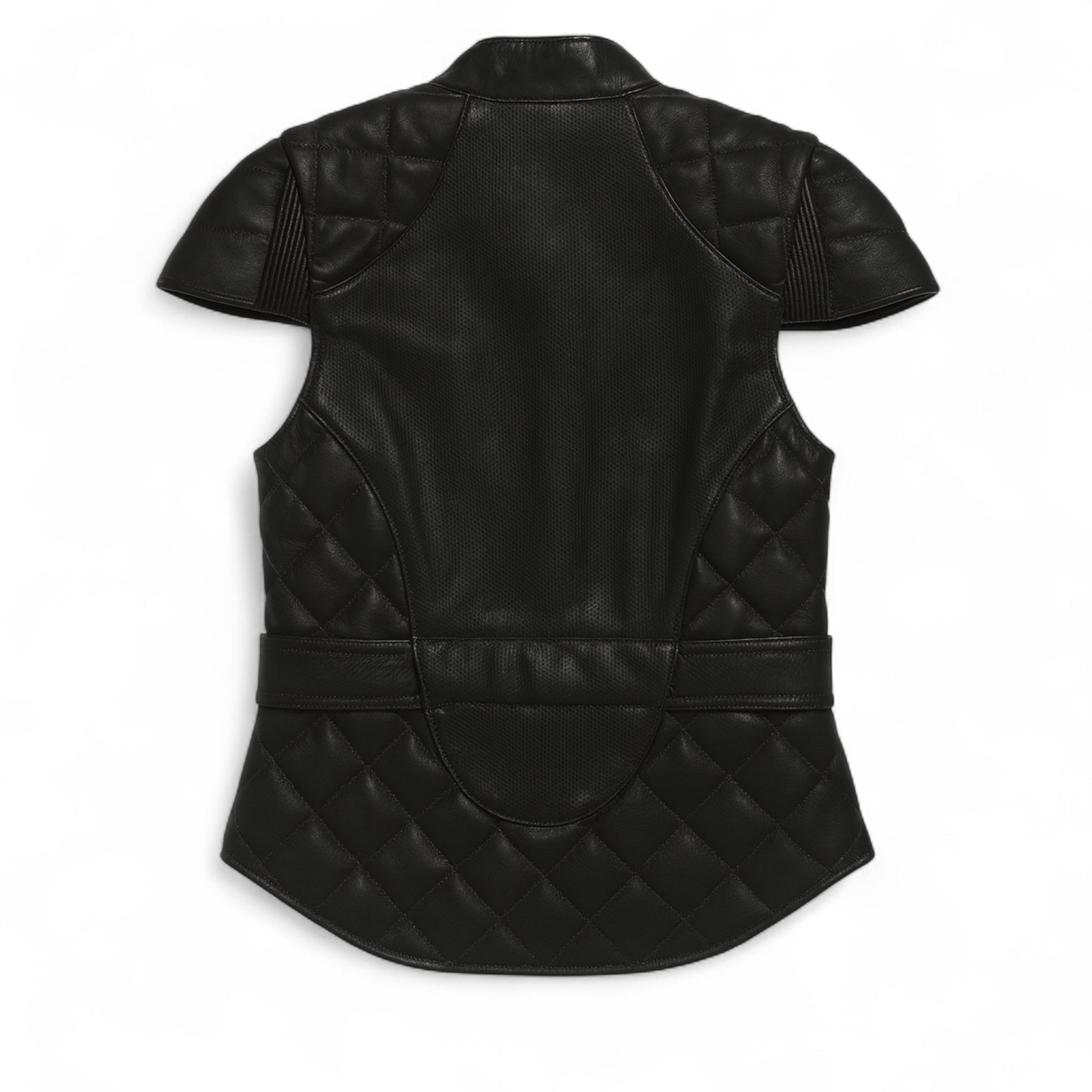 A stylish black leather vest featuring a quilted design, short sleeves, and a sleek zipper closure, complemented by a bold belt for a modern, edgy look.