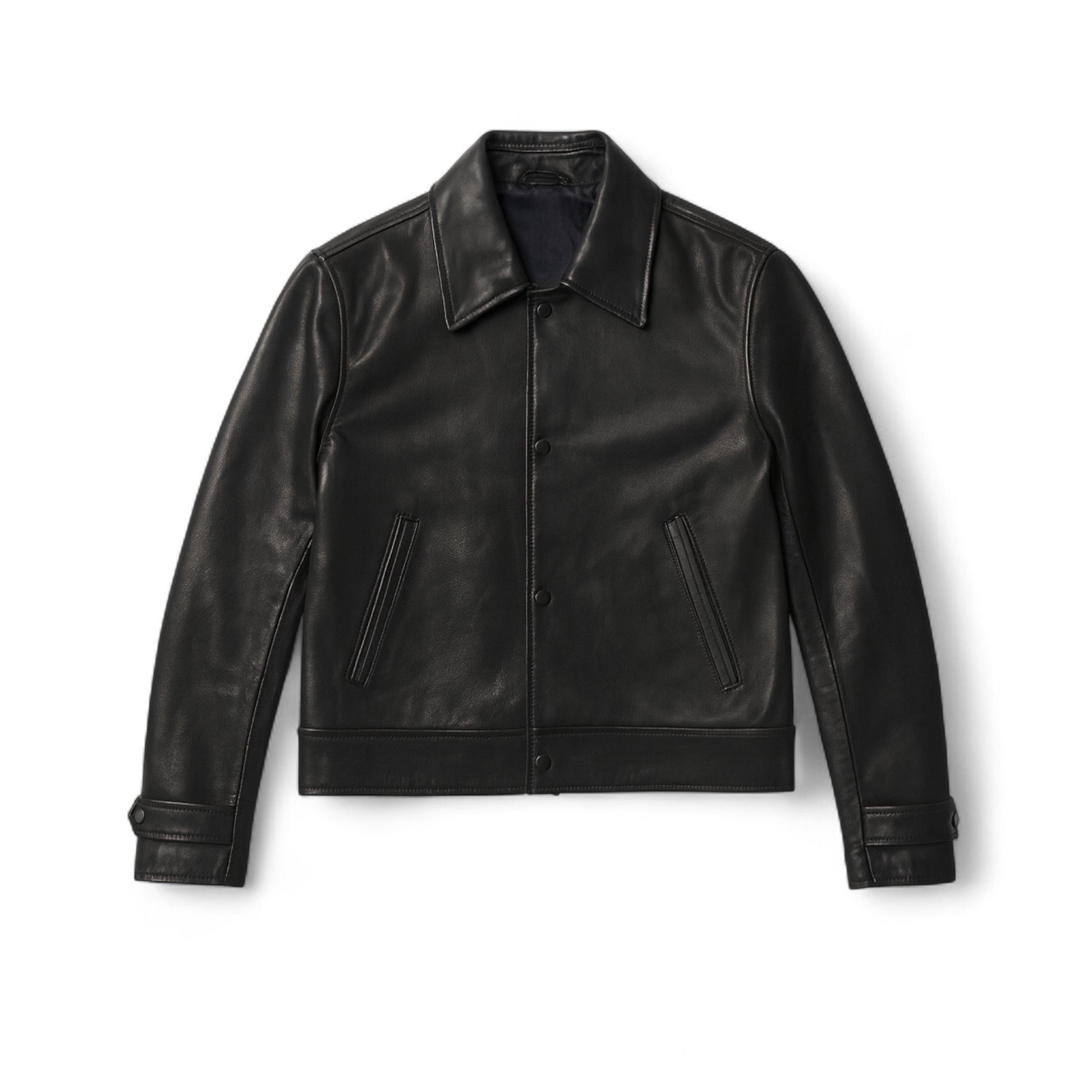 A sleek black leather jacket featuring a classic collar, button closure, and side pockets, perfect for adding a touch of sophistication to any outfit.